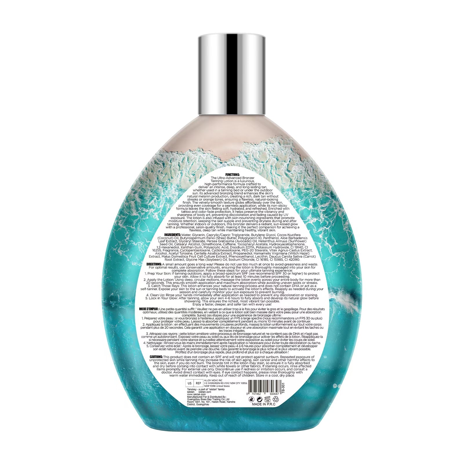This tanning lotion for tanning beds and outdoor sun does not contain an SPF and will not protect against sunburn. Repeated exposure of unprotected skin while tanning may increase the risk of skin ageing, skin cancer and other harmful effects to the skin, even if you do not burn. Discontinue use if irritation occurs. Avoid contact with eyes and fabrics. Keep out of reach of children. For external use only.