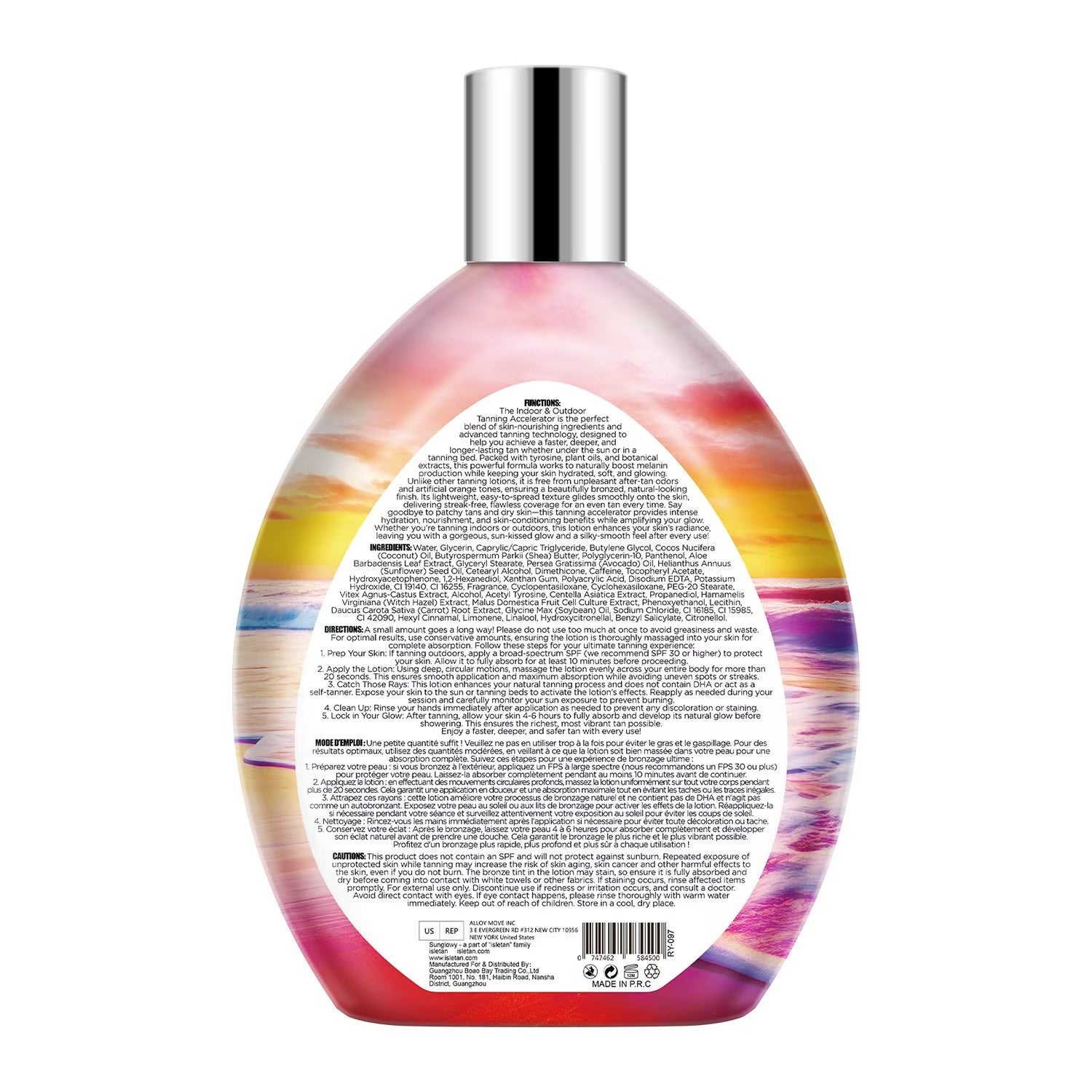 This tanning lotion for tanning beds and outdoor sun does not contain an SPF and will not protect against sunburn. Repeated exposure of unprotected skin while tanning may increase the risk of skin ageing, skin cancer and other harmful effects to the skin, even if you do not burn. Discontinue use if irritation occurs. Avoid contact with eyes and fabrics. Keep out of reach of children. For external use only.